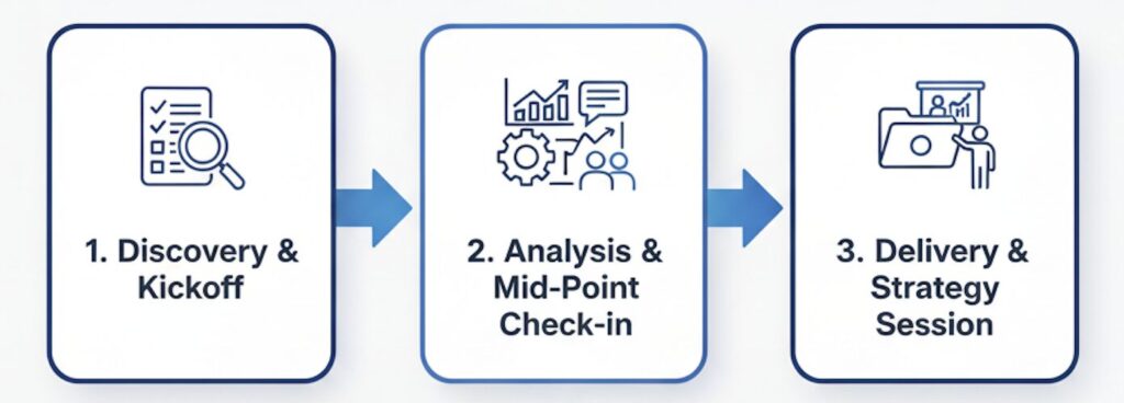 2. Analysis & Mid-point Check-in: We conduct our deep-dive analysis and hold a check-in meeting to share early findings and confirm our direction.